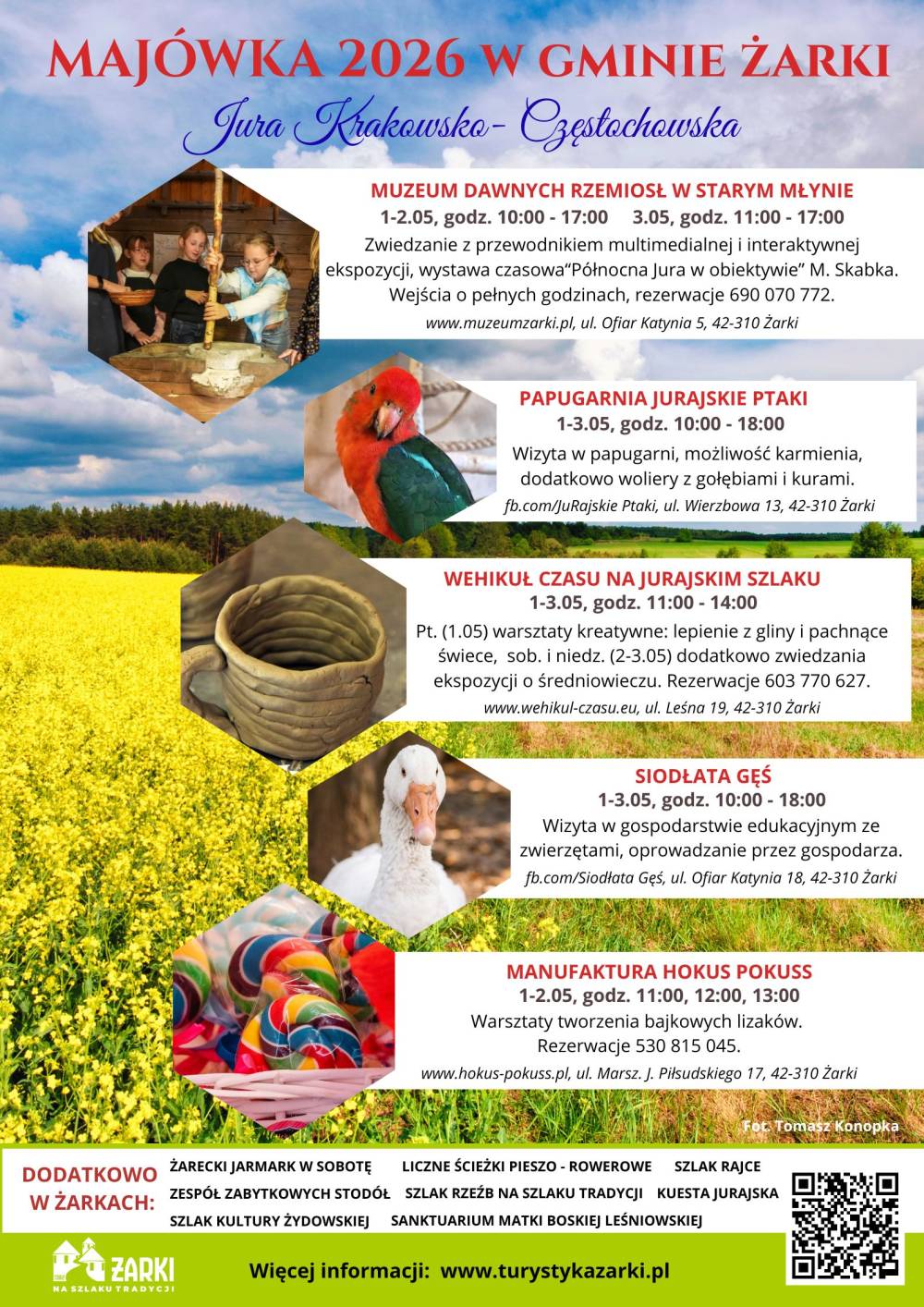 • MUZEUM DAWNYCH RZEMIOSŁ W STARYM MŁYNIE – oferuje zwiedzanie z przewodnikiem. Multimedialna i interaktywna ekspozycja prezentuje dawne tradycje rzemieślnicze, dodatkowo na odwiedzających czeka bezpłatna wystawa fotograficzna „Północna Jura w obiektywie” Marcina Skabka. Muzeum czynne:1–2.05 godz. 10:00–17:00 oraz 3.05 godz. 11:00–17:00.