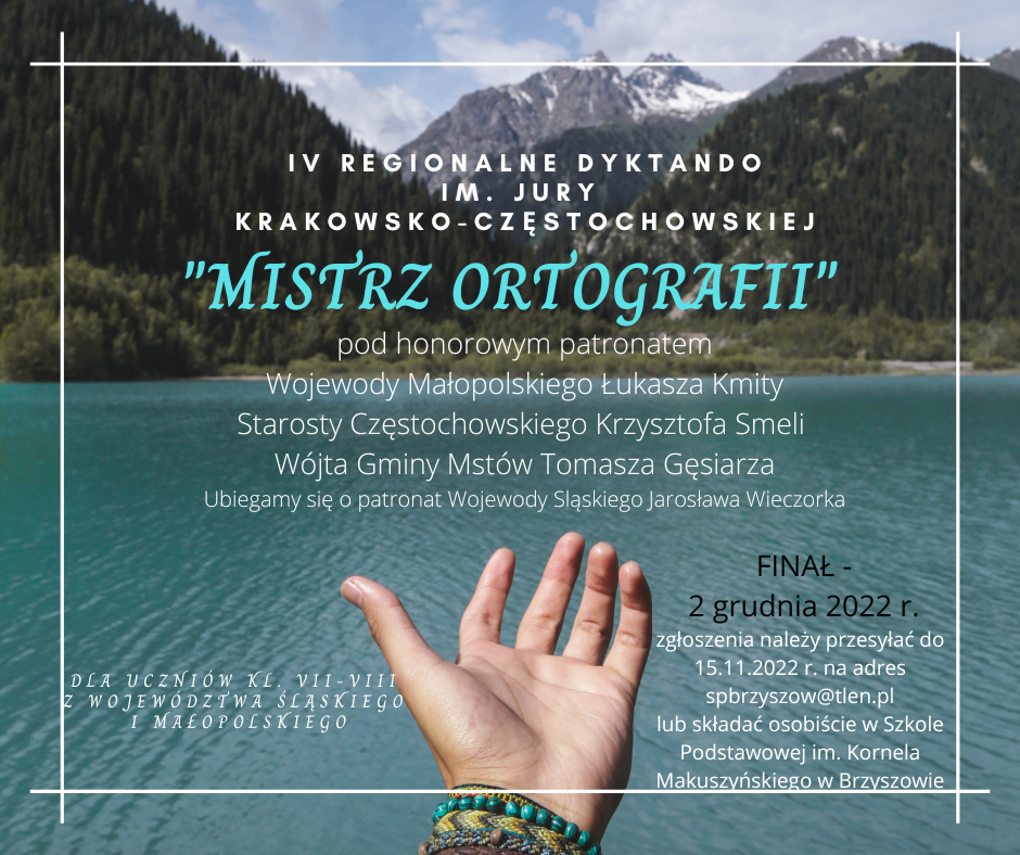 - Regionalne dyktando jest kontynuacją III Powiatowego Konkursu „Mistrz Ortografii” pod honorowym patronatem Wojewody Małopolskiego Łukasza Kmity , Wojewody Śląskiego Jarosława Wieczorka, Starosty Częstochowskiego Krzysztofa Smeli , Wójta Gminy Mstów Tomasza Gęsiarza