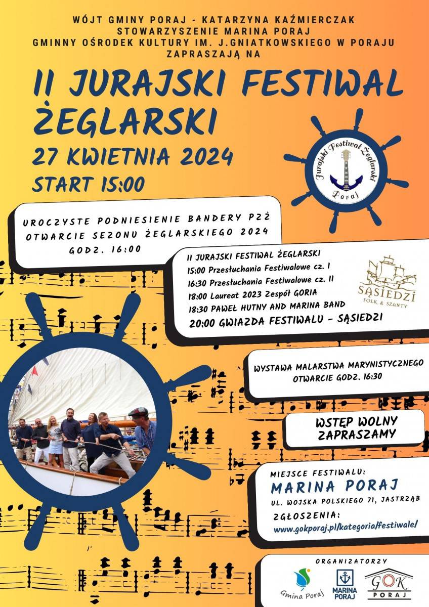 27 kwietnia- Poraj- Marina Poraj Jastrząb- II Jurajski Festiwal Żeglarski- najlepsza muzyka żeglarska, niespotykany klimat, żeglarska atmosfera, występy młodych artystów i koncert gwiazdy sceny ,,SĄSIEDZI”. Imprezie towarzyszyć będzie podniesienie bandery i rozpoczęcie nowego sezonu żeglarskiego 2024 oraz wystawa malarstwa marynistycznego http://gokporaj.pl/ii-jurajski-festiwal-zeglarski/