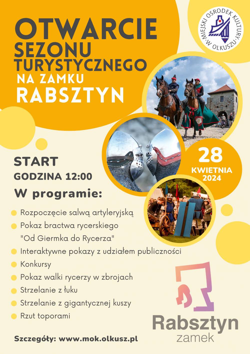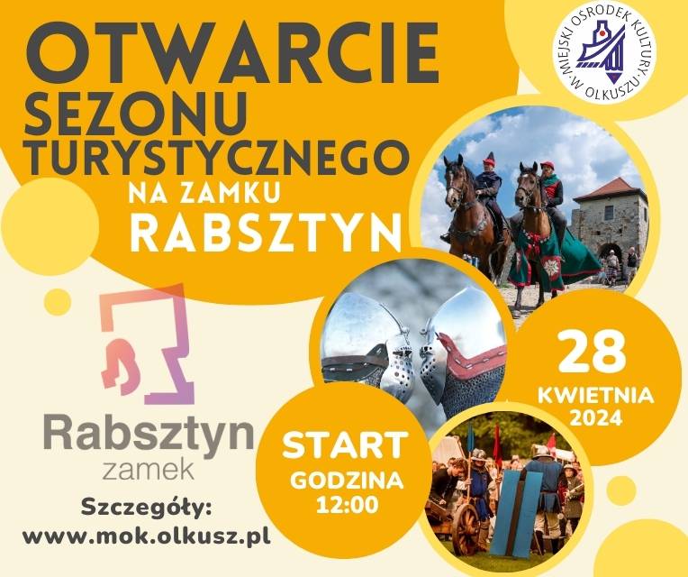 28 kwietnia- Olkusz- Zamek Rabsztyn- Otwarcie Sezonu Turystycznego- Jak co roku, Zamek Rabsztyn z hukiem otwiera sezon turystyczny w mieście i gminie Olkusz. Na przybyłych gości czeka szereg atrakcji – pokazy historyczne, lokalna kuchnia oraz animacje dla całych rodzin https://zamekrabsztyn.pl/